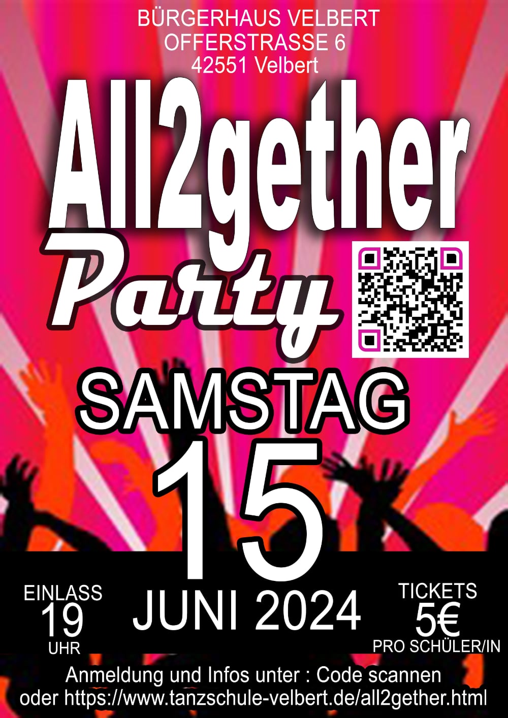 Zum Ablauf: Scannt den QR-Code auf unserem Plakat oder folgt dem Link, um auf unsere Webseite zu gelangen und eure Daten einzutragen. Nachdem ihr Eure E-Mail-Adresse bestätigt habt, bekommt Ihr Eure persönliches Ticket per E-Mail mit einem QR-Code. Kommt dann am 15. Juni mit eurer Eintrittskarte / QR-Code (ausgedruckt oder auf eurem Handy) und eurem Schülerausweis zur Disco. Der Eintritt beträgt fünf Euro.